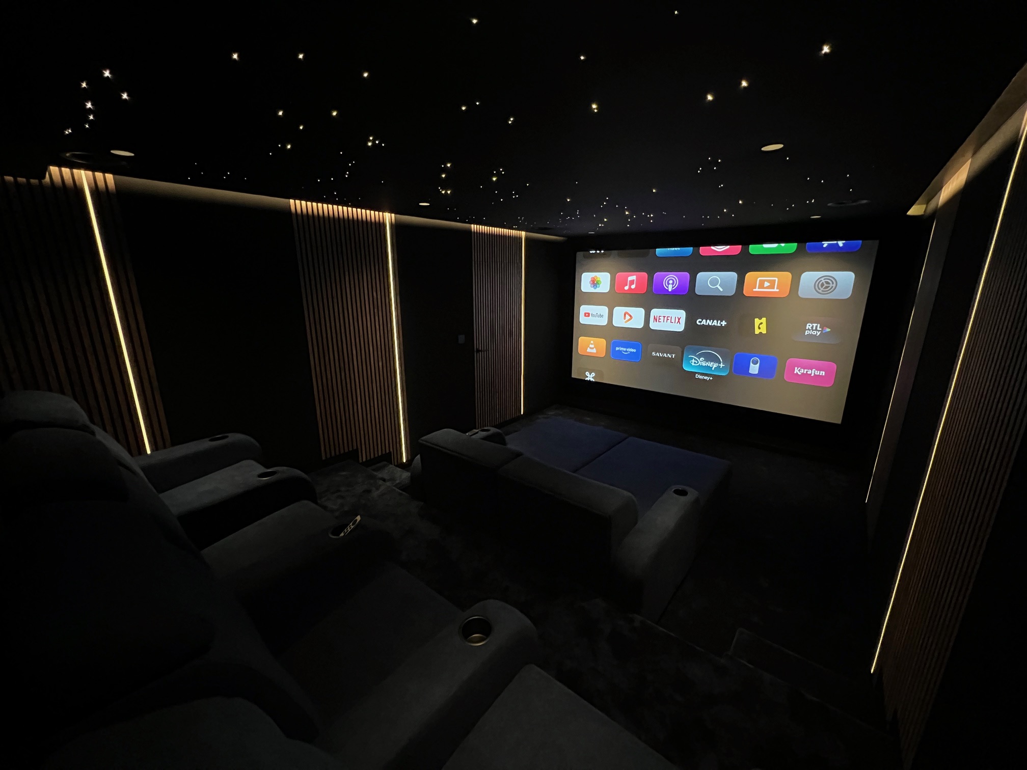 Pour une expérience encore plus immersive, SWAL propose également des ciels étoilés. Grâce à un système de fibres optiques intégrées dans la toile, le plafond se transforme en véritable ciel nocturne, avec un scintillement réaliste et modulable selon vos envies. Cette ambiance crée une atmosphère magique, relaxante et captivante, idéale pour prolonger l’expérience cinéma ou pour transformer la pièce en espace unique de détente.